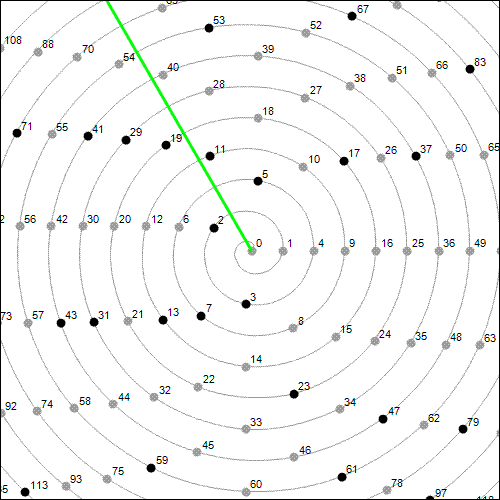 | I have a special reason for including angle 1/4 on this page. When I first wrote this website in 2003, I didn't realize that every rational angle has composite curves. Therefore I was puzzled by the prominent columns of non-prime numbers that march north and south from the center of the spiral, and I published the following picture as a mystery to be solved later: |